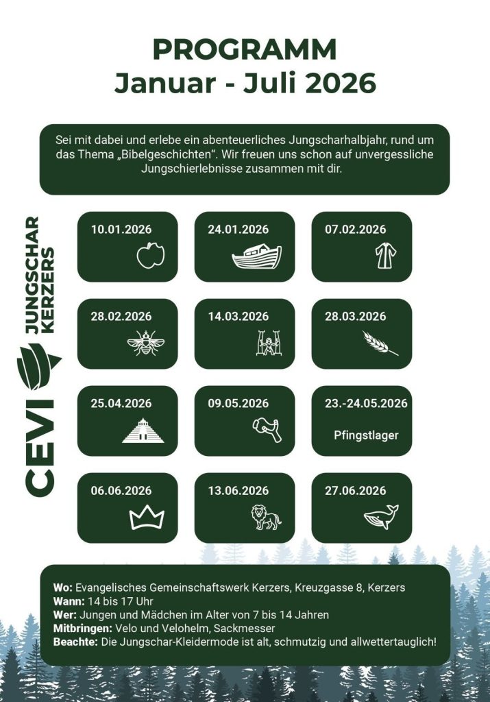 In der Jungschar erleben Kinder im Alter von 7 bis 14 Jahren alle zwei Wochen jeweils ein abwechslungsreiches Nachmittagsprogramm. Oft sind wir im Wald, daher sind wir auf Velos angewiesen. Treffpunkt ist bei der Kreuzgasse 8 in Kerzers um 14:00 Uhr. Wir freuen uns auf dich!